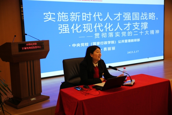 研討會邀請中央黨校易麗麗副教授作題為《實(shí)施新時代人才強(qiáng)國戰(zhàn)略,強(qiáng)化現(xiàn)代化人才支撐—學(xué)習(xí)領(lǐng)會二十大精神》報(bào)告,她從科技、教育、人才在近五次黨代會報(bào)告中的定位入手,深入淺出的講解了實(shí)施人才強(qiáng)國戰(zhàn)略能夠極大地推進(jìn)科教興國戰(zhàn)略和創(chuàng)新驅(qū)動發(fā)展戰(zhàn)略的有效實(shí)施、能夠有效應(yīng)對我國現(xiàn)代化建設(shè)中所面臨的新挑戰(zhàn)等內(nèi)容,并根據(jù)中科院的人才發(fā)展機(jī)制分析了激發(fā)人才創(chuàng)新活力這個戰(zhàn)略問題。