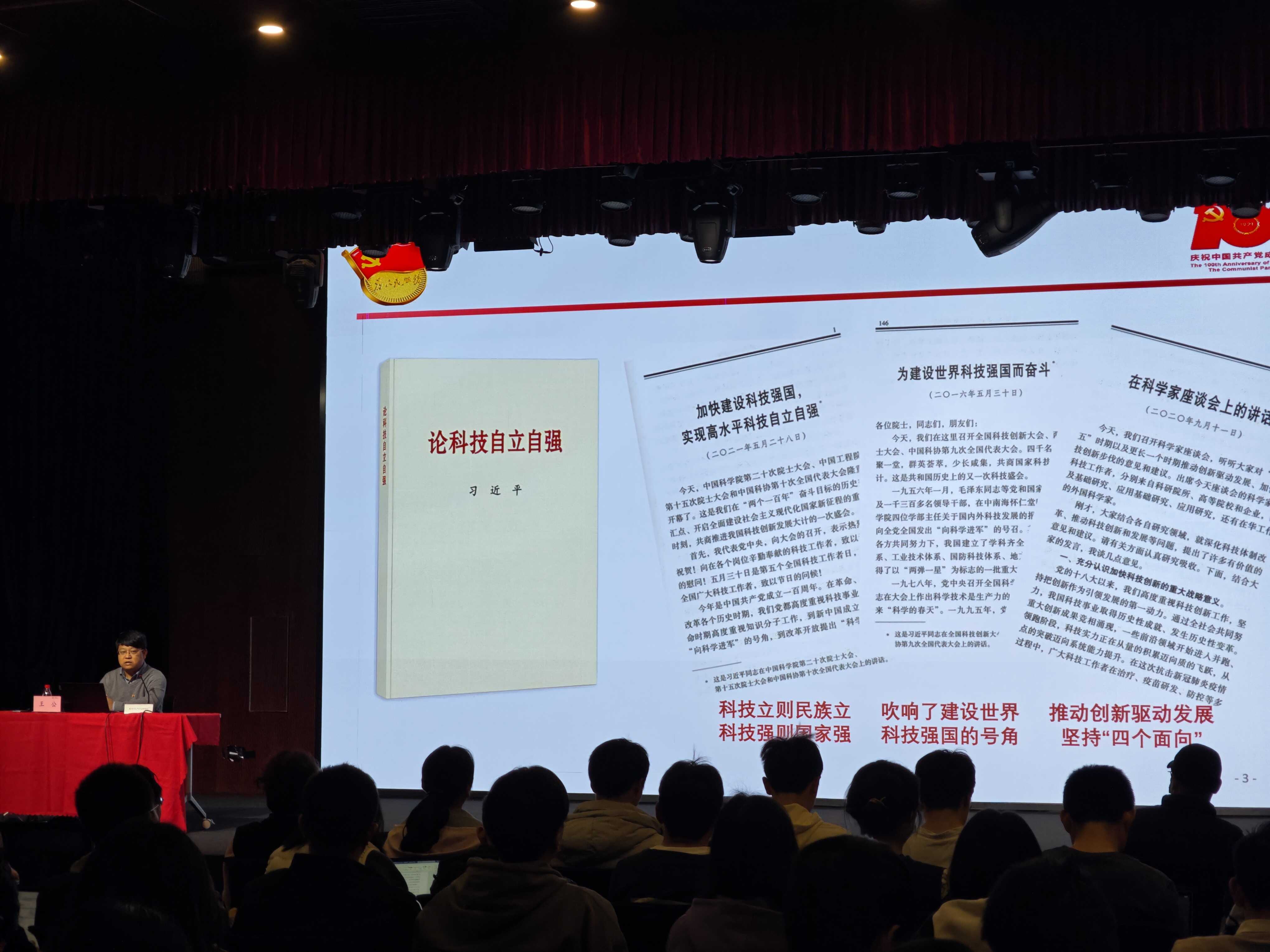 下午,王公老師為大家作題為《中國(guó)共產(chǎn)黨領(lǐng)導(dǎo)中國(guó)科技自立自強(qiáng)》的報(bào)告,報(bào)告從中國(guó)悠久的科技傳統(tǒng)出發(fā),和大家分享近代中國(guó)的科學(xué)救國(guó)、新中國(guó)科技事業(yè)的獨(dú)立自主和新時(shí)代從科技大國(guó)邁向科技強(qiáng)國(guó)的歷程,分享在中華民族偉大復(fù)興的征程上,一代又一代科學(xué)家心系祖國(guó)和人民,不畏艱難、無私奉獻(xiàn)的感人事跡。