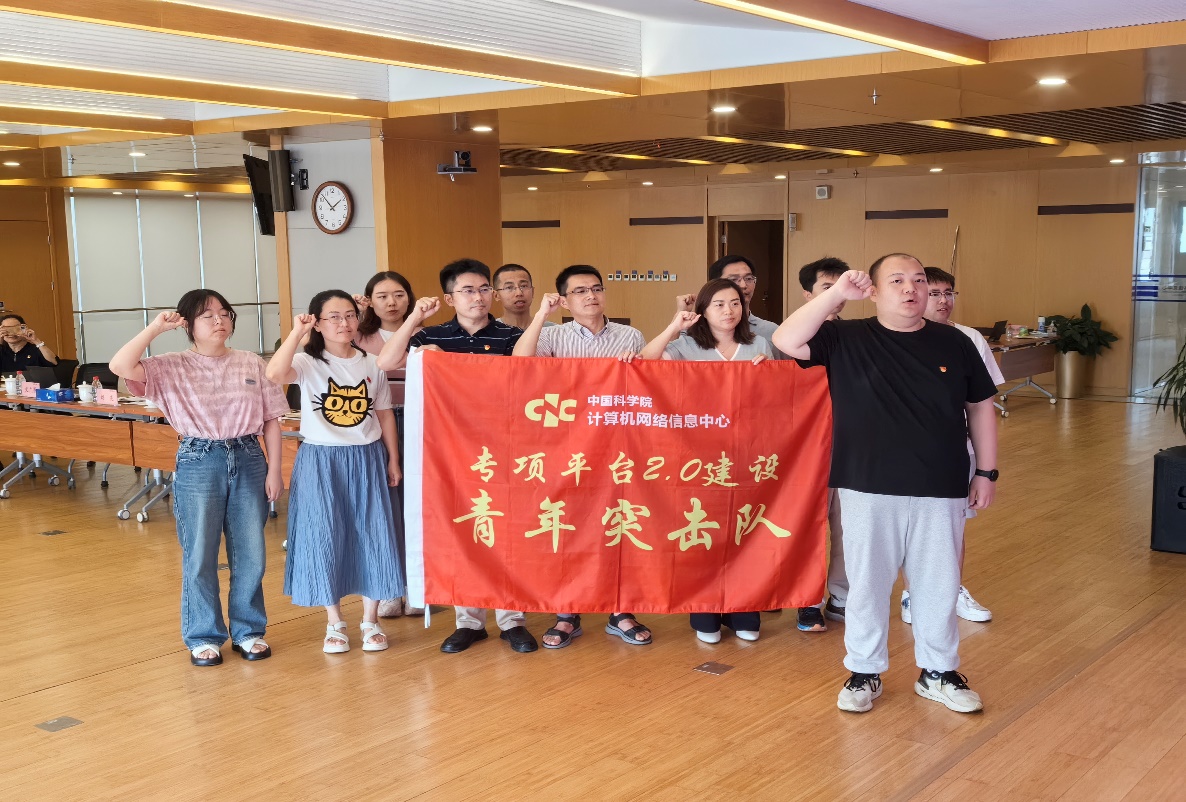 ????周園春宣讀了《中共中國科學(xué)院計算機網(wǎng)絡(luò)信息中心委員會關(guān)于成立“專項平臺2.0建設(shè)青年突擊隊”的決定》,孫德剛向青年突擊隊授旗。青年突擊隊隊員在黨旗和團旗下宣誓:用實際行動踐行青年突擊隊的精神,在青春的道路上奮力前行!為加快搶占科技制高點提供堅強有力的網(wǎng)信支撐貢獻青春力量!