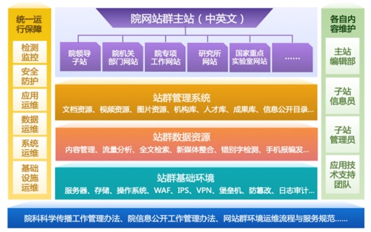 中國(guó)科學(xué)院網(wǎng)站群(以下簡(jiǎn)稱網(wǎng)站群)由中國(guó)科學(xué)院網(wǎng)站、院機(jī)關(guān)各部門(mén)網(wǎng)站、院屬各單位網(wǎng)站及其下屬機(jī)構(gòu)網(wǎng)站組成,按照“集中運(yùn)行、分級(jí)管理、制度約束、服務(wù)保障”的原則建設(shè)管理,是中國(guó)科學(xué)院展示機(jī)構(gòu)發(fā)展、分享科研進(jìn)展、發(fā)布創(chuàng)新成果的“第一平臺(tái)”。