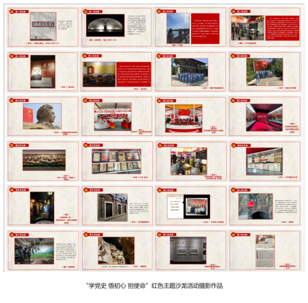 本次展現(xiàn)最多的是攝影作品,24幅作品都是各支部黨史學(xué)習(xí)經(jīng)歷和體會。第一黨支部師亮的母親書寫了“學(xué)黨史悟初心”贈給兒子,希望兒子面對世界百年未有之大變局,欲知大道,必先為史。第二黨支部展現(xiàn)了《遵義會議》、《盧溝橋》、《1977年恢復(fù)高考》等不同歷史時期的關(guān)鍵事件。第三黨支部汪海燕的《共和國的豐碑·橘子洲頭》展現(xiàn)了青年毛澤東堅定不移的信念和投身革命的豪情。第三黨支部展示的同志們赴西柏坡緬懷革命先輩的豐功偉績,飄揚的紅旗下同志們隊列訓(xùn)練、短途行軍,那莊重、嚴(yán)肅的神情將我們帶回到了戰(zhàn)火紛飛的年代,眼前的同志們儼然就是堅定信念的新四軍戰(zhàn)士。第五黨支部韓琨展示了《共產(chǎn)黨宣言》、《長征》以及張思思展示的《中共一大會址》、《槍桿子里面出政權(quán)》將歷史再一次再現(xiàn)。第七黨支部著重將“紅旗渠”的歷史展現(xiàn):《耕者有田》是1947年頒布的《中國土地法大綱》從根本上鏟除了中國封建制度的根基,實現(xiàn)了耕者的千年夢想?!肚捅谧鳂I(yè)》展現(xiàn)的事是修紅旗渠時青年們腰部懸掛吊繩在懸崖峭壁進行開鑿,紅旗渠精神是偉大民族精神在社會主義建設(shè)時期的時代體現(xiàn)。第八黨支部王洋展示了“赴西柏坡廉政教育紀(jì)實”系列作品警示大家革命成果來之不易,務(wù)必謙虛謹(jǐn)慎、不驕不躁,始終保持艱苦奮斗的作風(fēng)。