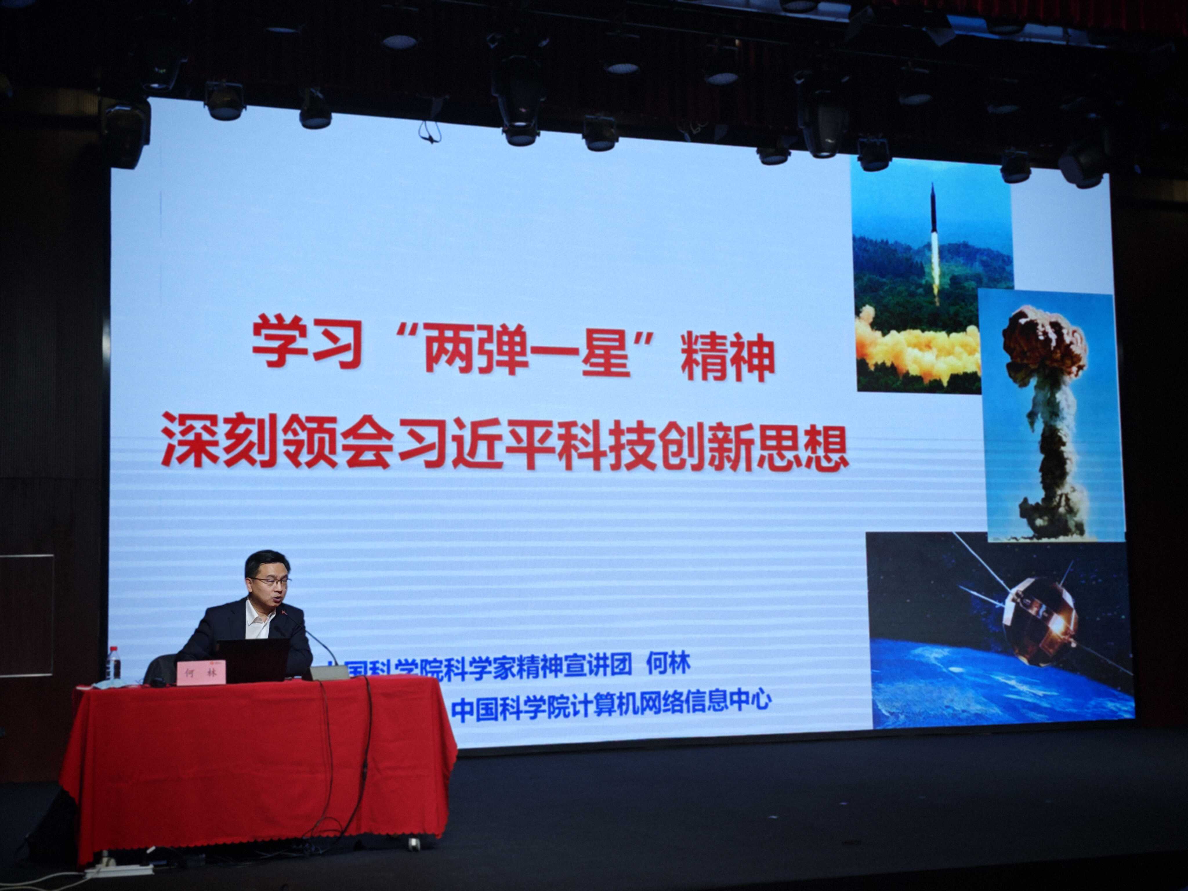 上午,何林老師作題為《學(xué)習(xí)“兩彈一星”精神 ?深刻領(lǐng)會(huì)習(xí)近平科技創(chuàng)新思想》的報(bào)告,從國(guó)家決策、以身許國(guó)、艱苦創(chuàng)業(yè)和大師風(fēng)范四個(gè)方面,向大家娓娓道來,講述了在我國(guó)科技實(shí)力和工業(yè)基礎(chǔ)相對(duì)落后的條件下,廣大科技工作者發(fā)揚(yáng)艱苦奮斗、奮發(fā)圖強(qiáng)的拼搏精神,大力協(xié)同,聯(lián)合攻關(guān),譜寫了中華民族攀登世界科技高峰的壯麗凱歌。