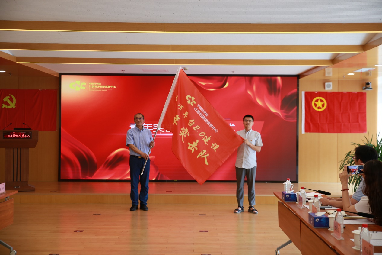 ????周園春宣讀了《中共中國科學(xué)院計算機網(wǎng)絡(luò)信息中心委員會關(guān)于成立“專項平臺2.0建設(shè)青年突擊隊”的決定》,孫德剛向青年突擊隊授旗。青年突擊隊隊員在黨旗和團旗下宣誓:用實際行動踐行青年突擊隊的精神,在青春的道路上奮力前行!為加快搶占科技制高點提供堅強有力的網(wǎng)信支撐貢獻青春力量!