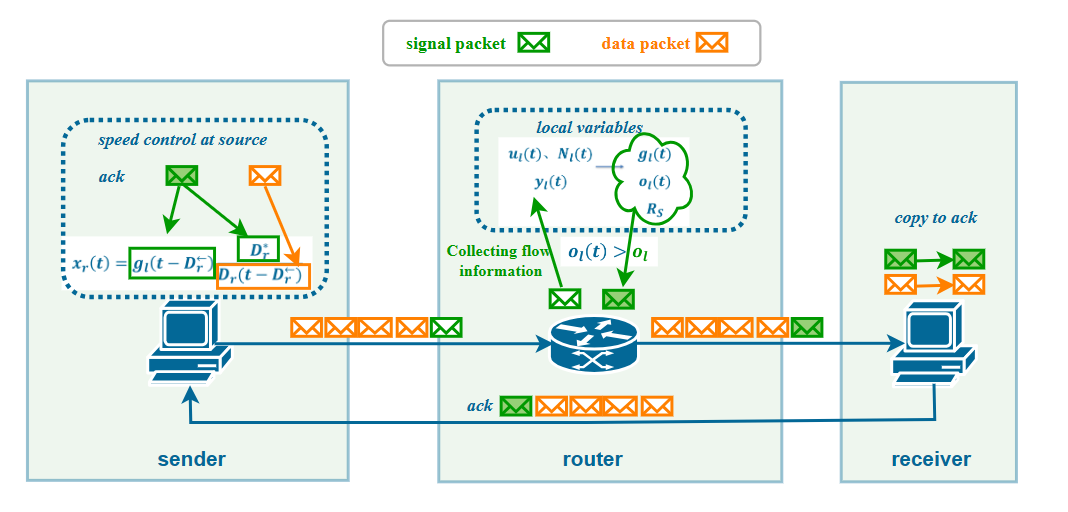 大規(guī)模人工智能訓(xùn)練等新興業(yè)務(wù)極其依賴海量數(shù)據(jù)的高速傳輸。由于TCP協(xié)議采用保守的擁塞控制機(jī)制,導(dǎo)致傳輸吞吐量較低;而終端的高開銷和交換機(jī)淺緩沖區(qū)則成為超高速網(wǎng)絡(luò)傳輸面臨的性能瓶頸。我中心先進(jìn)網(wǎng)絡(luò)部提出了一種超高速網(wǎng)絡(luò)高可擴(kuò)展主動擁塞控制方法AdaptaCC,通過少量信號包實(shí)現(xiàn)終端和交換機(jī)之間信息交互,由交換機(jī)計算公平速率并反饋至終端,并無需修改數(shù)據(jù)包格式。該方法已在仿真環(huán)境中進(jìn)行了實(shí)驗(yàn)與驗(yàn)證,結(jié)果表明AdaptaCC能夠快速、高效、公平地分配帶寬,最大化帶寬利用率,并具備低處理開銷和高可擴(kuò)展性優(yōu)勢,有效滿足新興業(yè)務(wù)的超高吞吐傳輸需求。