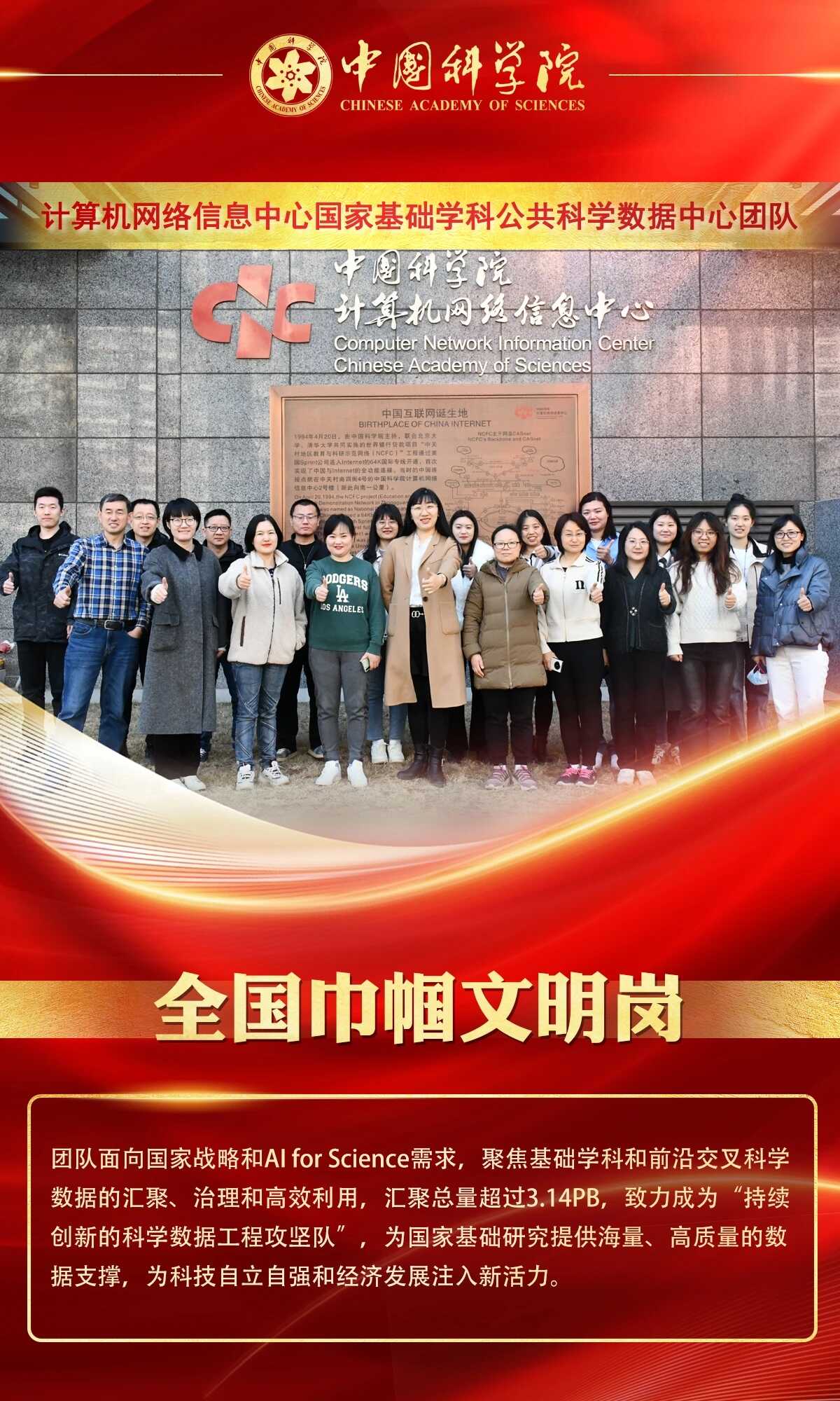 近日,全國婦聯(lián)、中央和國家機(jī)關(guān)婦工委分別公布全國三八紅旗手、全國三八紅旗集體、全國巾幗文明崗及中央和國家機(jī)關(guān)三八紅旗手、中央和國家機(jī)關(guān)三八紅旗集體名單。我院共計10名個人、5個集體榮獲表彰。其中,中心國家基礎(chǔ)學(xué)科公共科學(xué)數(shù)據(jù)中心團(tuán)隊榮獲全國巾幗文明崗表彰。