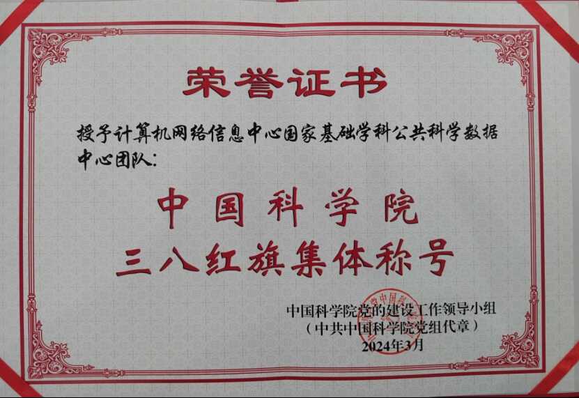我中心國家基礎學科公共科學數據中心團隊榮獲“中國科學院三八紅旗集體”稱號,并在我院3月6日舉行的“搶占科技制高點,巾幗逐夢立新功”先進事跡報告會暨表彰大會受到表彰。